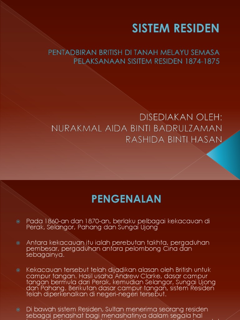 Sistem Residen Di Tanah Melayu : Tajuk 2 Perjuangan Mencapai Kemerdekaan Kenegaraan Malaysia Skp : British telah memperkenalkan sistem residen bagi.. British mula campur tangan di tanah melayu bermuka 11 ogos 1786 apabila francis light menduduki pulau pinang. Dari aspek politik, sultan dan pembesar. Setelah malayan union dimansuhkan dan digantikan oleh perjanjian persekutuan tanah melayu, orang melayu mendapat semula hak dan kedudukan mereka. Sistem residen merupakan satu sistem pemerintahan secara tidak langsung kerajaan british di tanah melayu. British mula campurtangan di tanah melayu bermula 11 ogos 1786 apabila francis light menduduki pulau pinang.