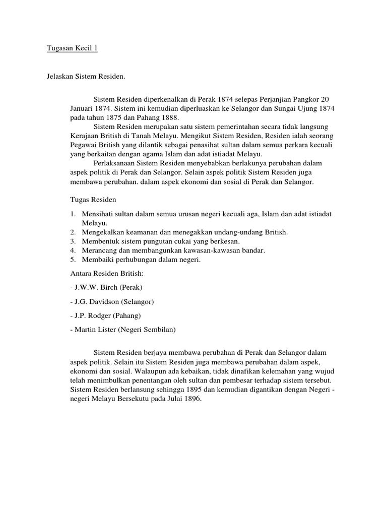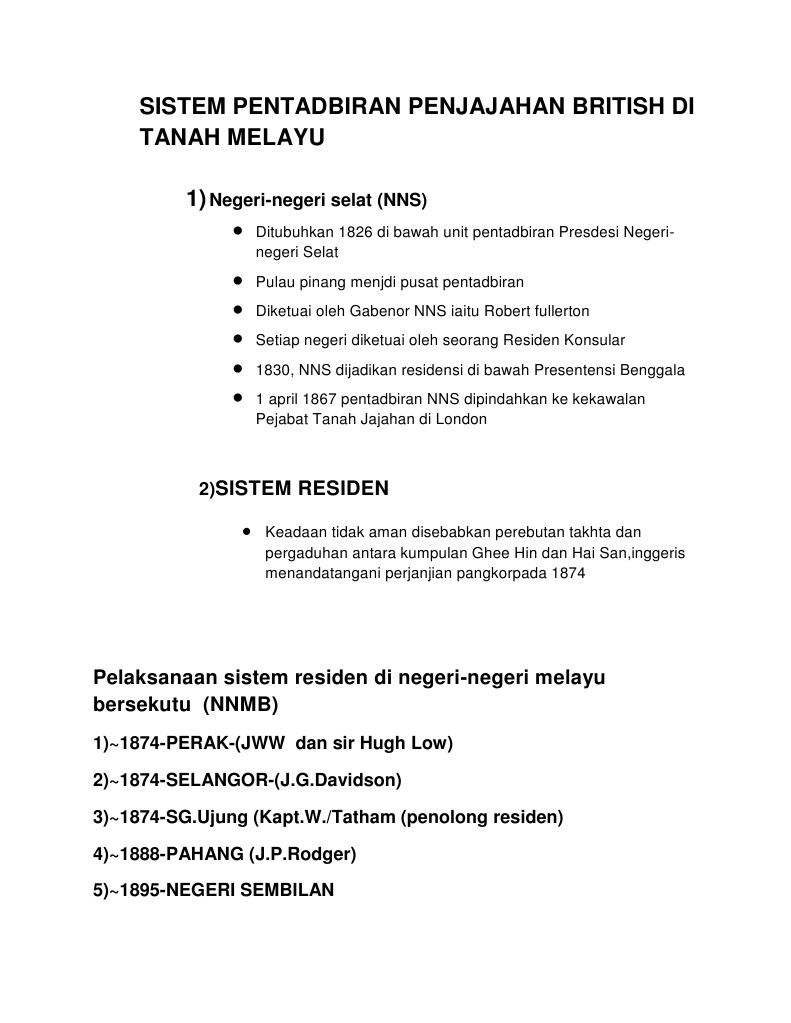 Sistem Residen from imgv2-2-f.scribdassets.com Kesan penjajahan british di tanah melayu terhadap ekonomi zaman penjaja… baca selengkapnya sistem residen di tanah melayu. § sistem residen telah mewujudkan kestabilan politik bagi membolehkan british meneruskan usaha mengeksploitasi kekayaan ekonomi di tanah melayu. Rakyat ketika itu berada di bawah belenggu mereka hampir dua ratus tahun. Pengenalan terhadap sistem pentadbiran moden. Residen menggugat kuasa sultan dan pembesar (teks m/s: Seperti yang diketahui, sistem pendidikan di tanah melayu mempunyai sejarah yang panjang untuk dilakar. Menggunakan perkhidmatan pawang dan bomoh. Campurtangan british di tanah melayu.